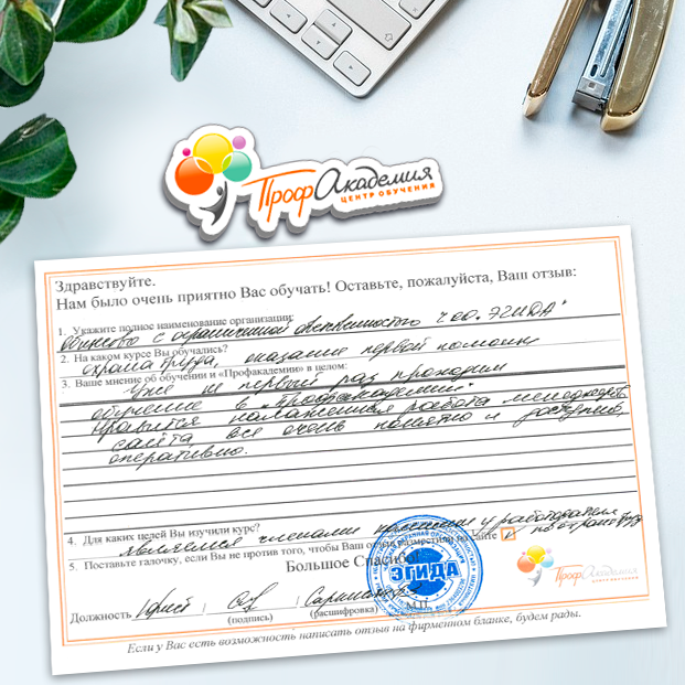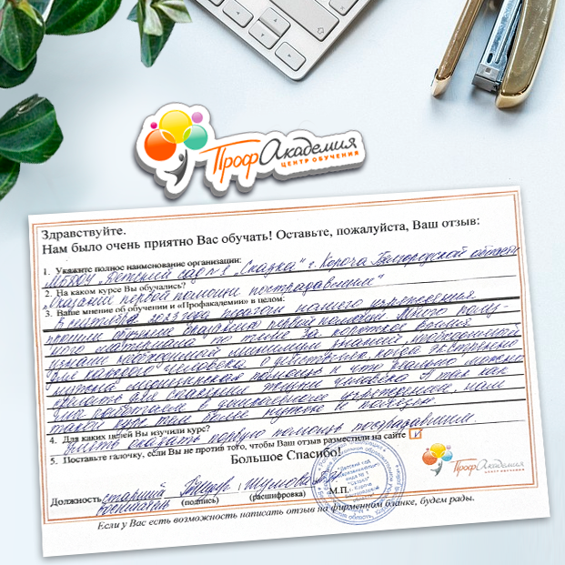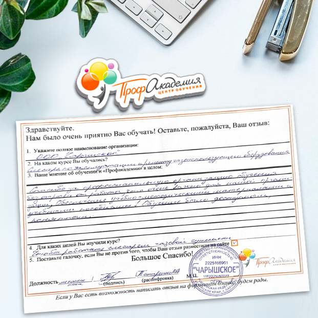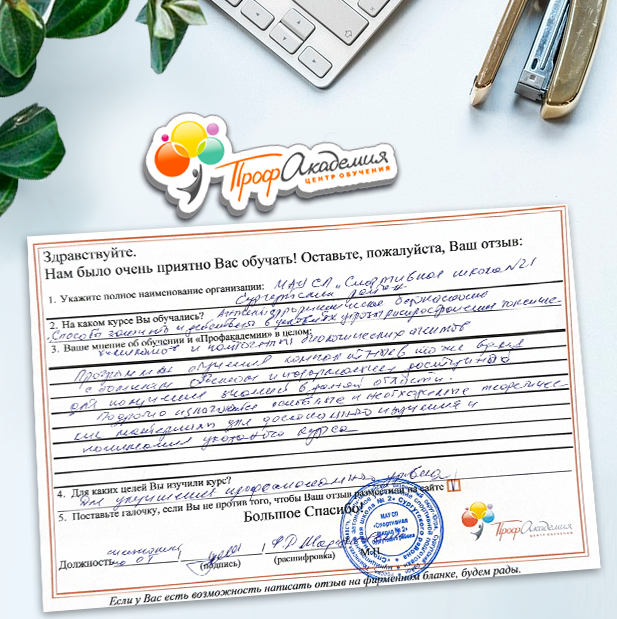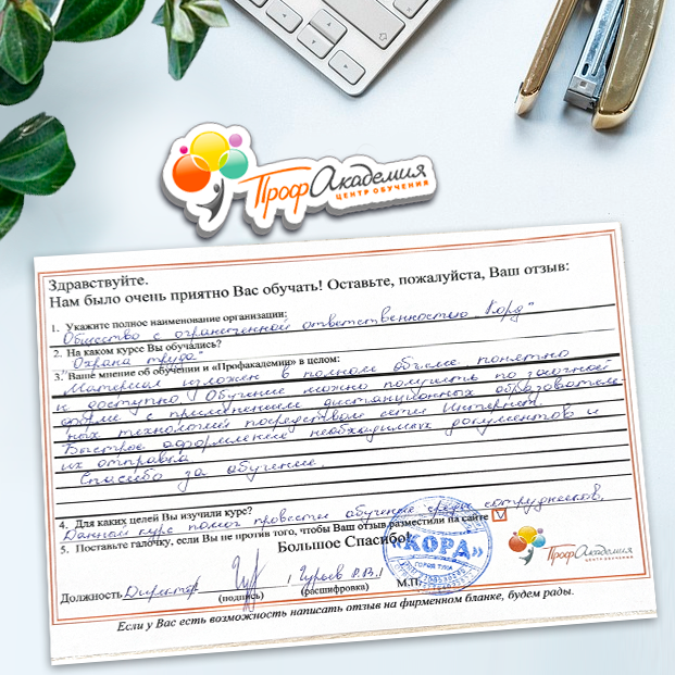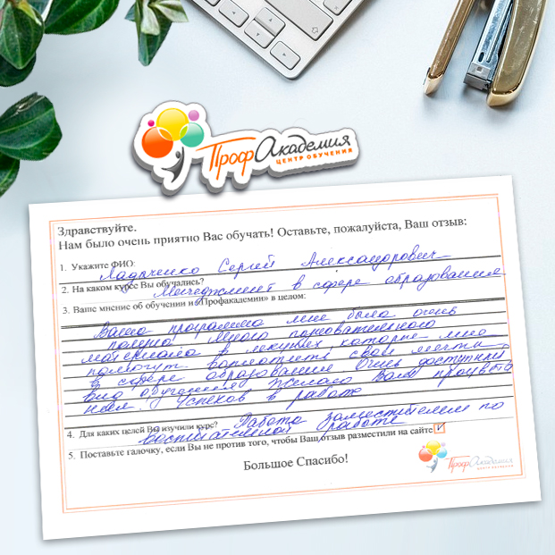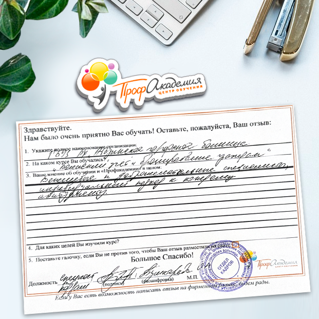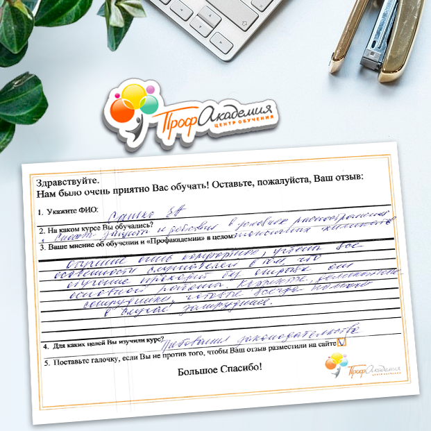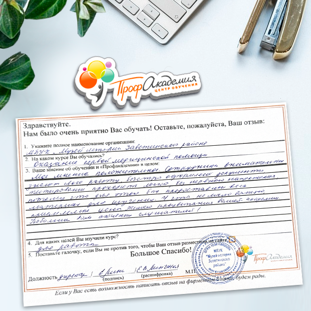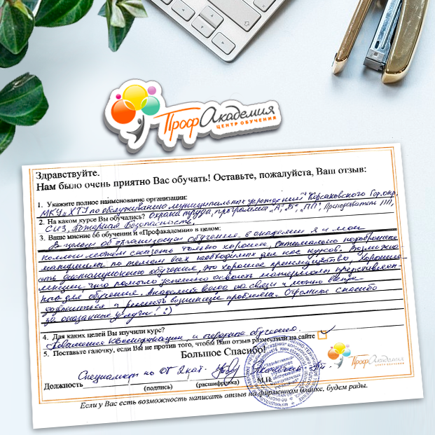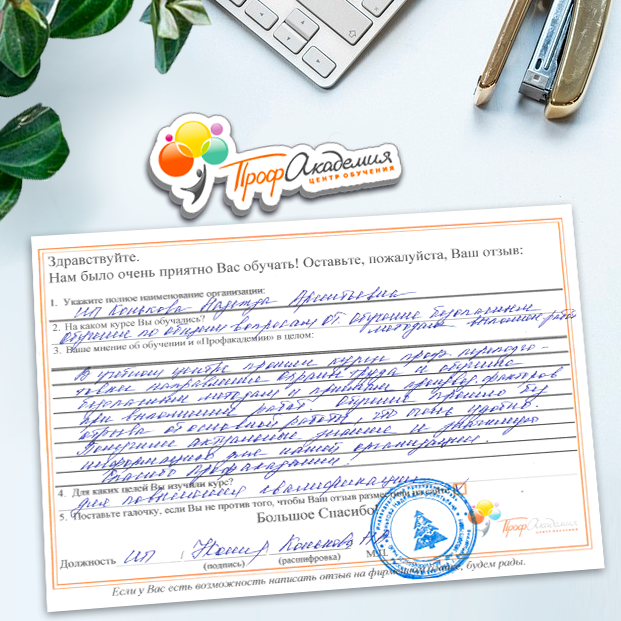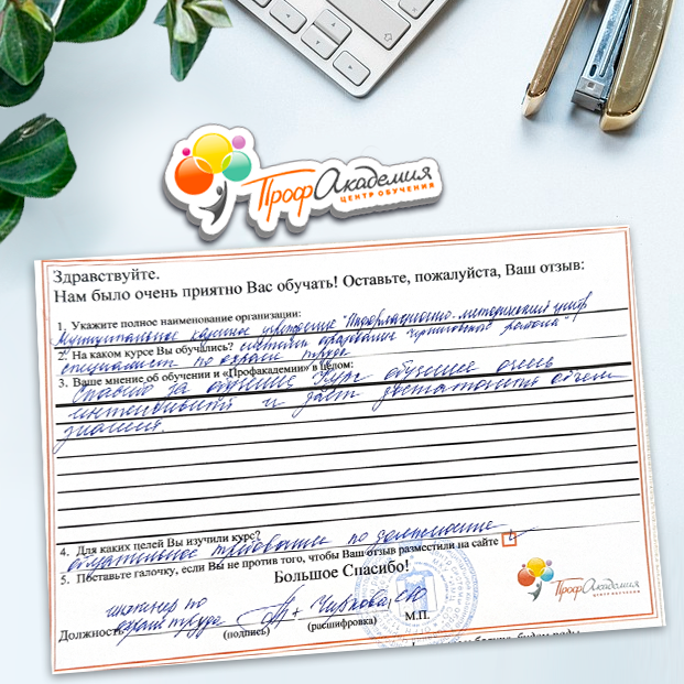 Спасибо Профакадемии за доступное обучение, наши сотрудники с легкостью прошли все курсы, информация в виде презентаций изложена очень четко, лаконично и быстро усваиваться. Мы уже стали Вашими постоянными учениками, будем и дальше взаимодействовать. С вами приятно работать