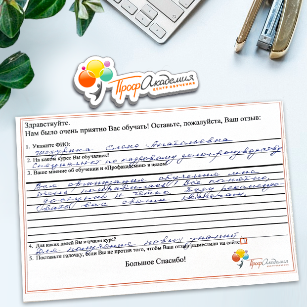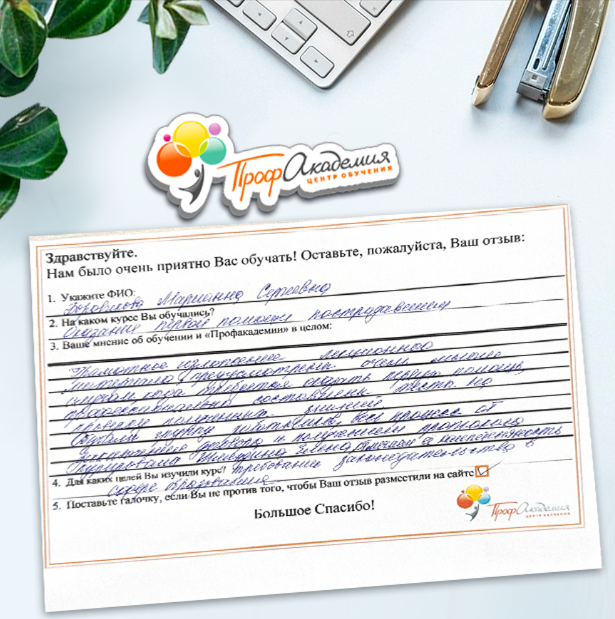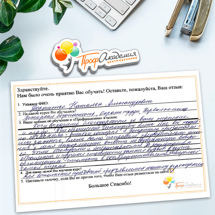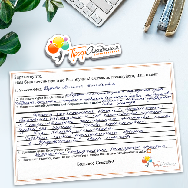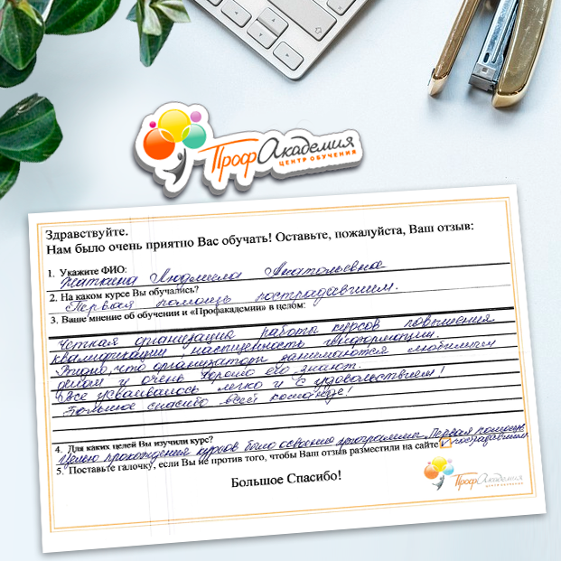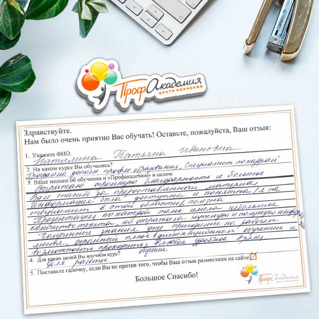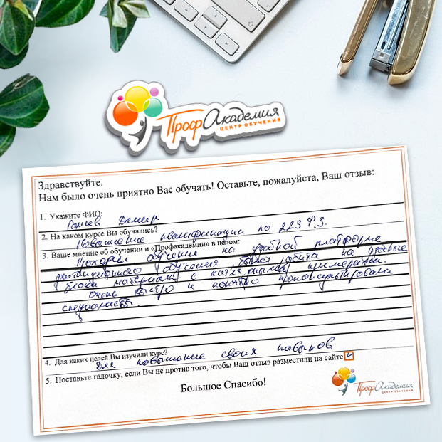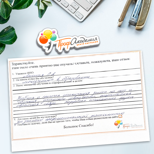 Очень приятно обучаться в "Профакадемии", все очень точно, быстро, внятно. Получила свое удостоверение, спасибо большое.