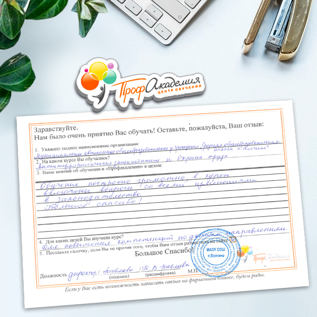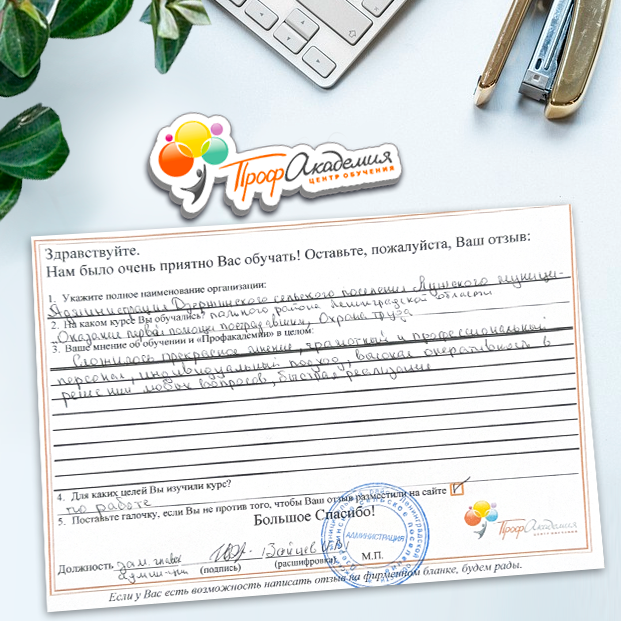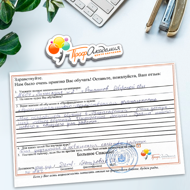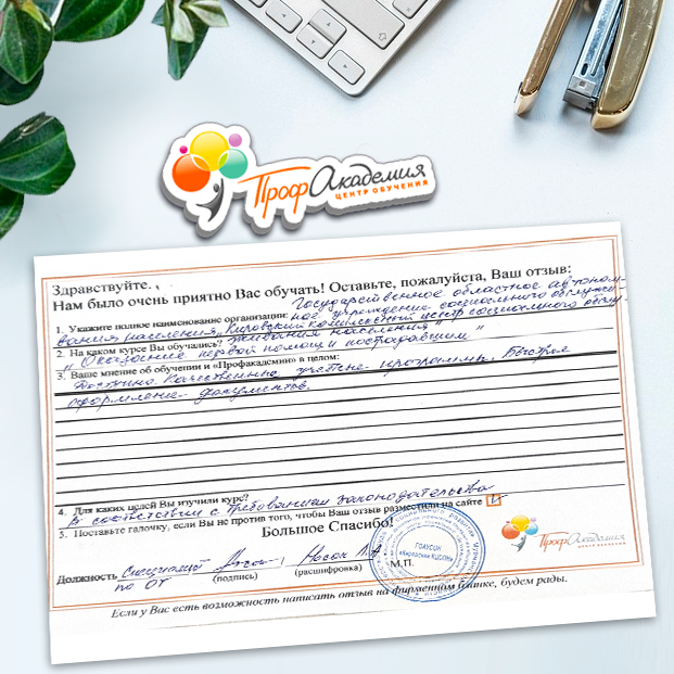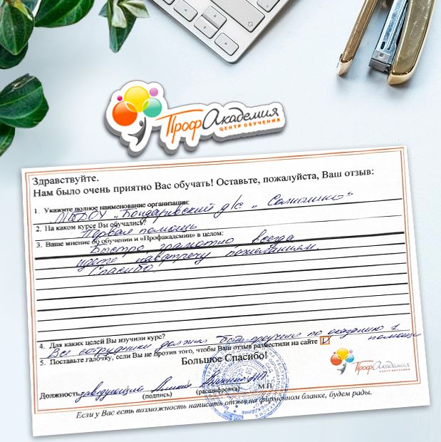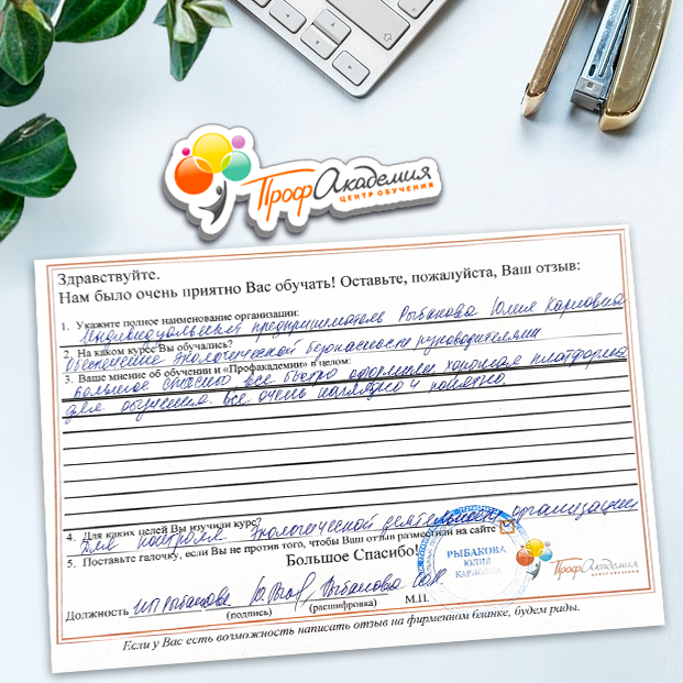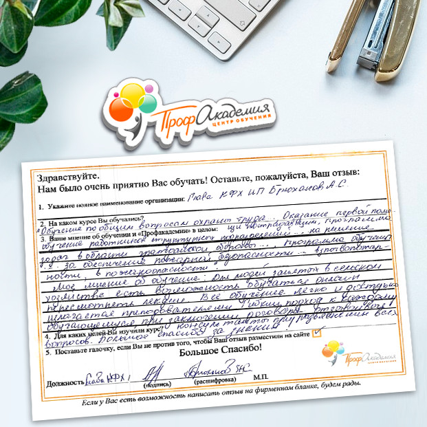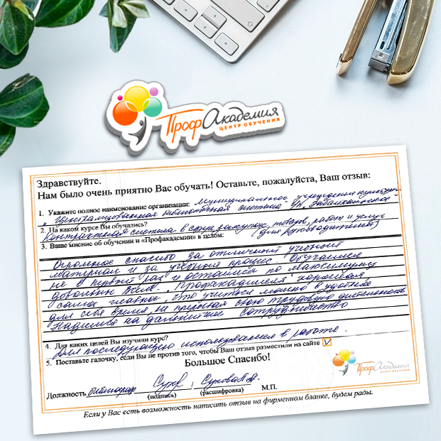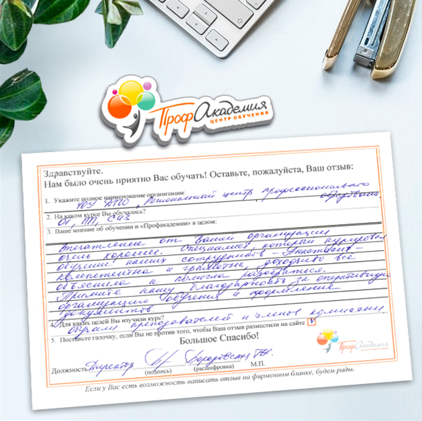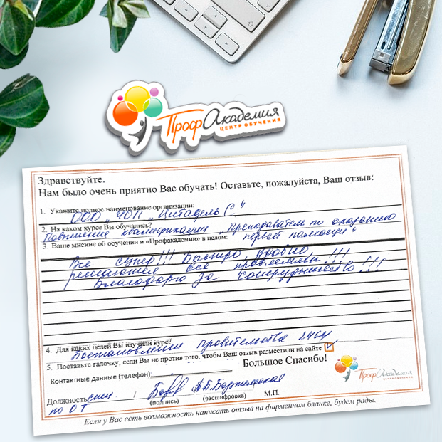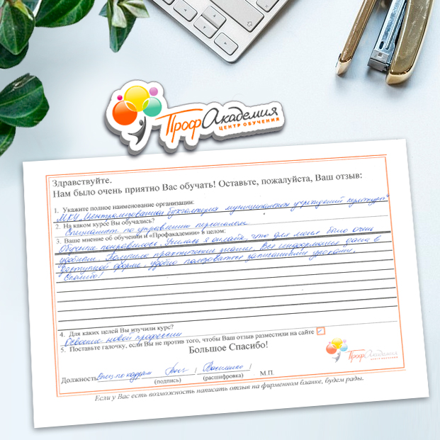 Для прохождения дополнительного профессионального образования для руководителя обращаемся в Профакадемию почти 10 лет. Хотим отметить высокий профессионализм сотрудников, доброжелательность и надежность. Команда работает качественно, без задержек и накладок. Спасибо за ваш труд! Успехов и процветания!