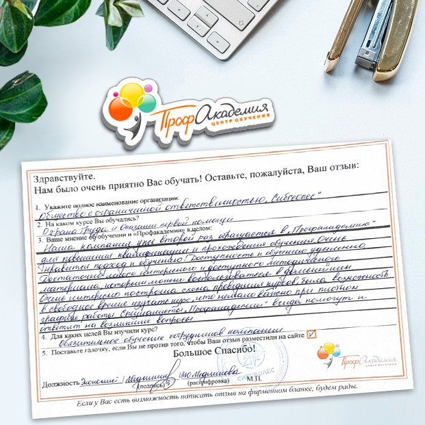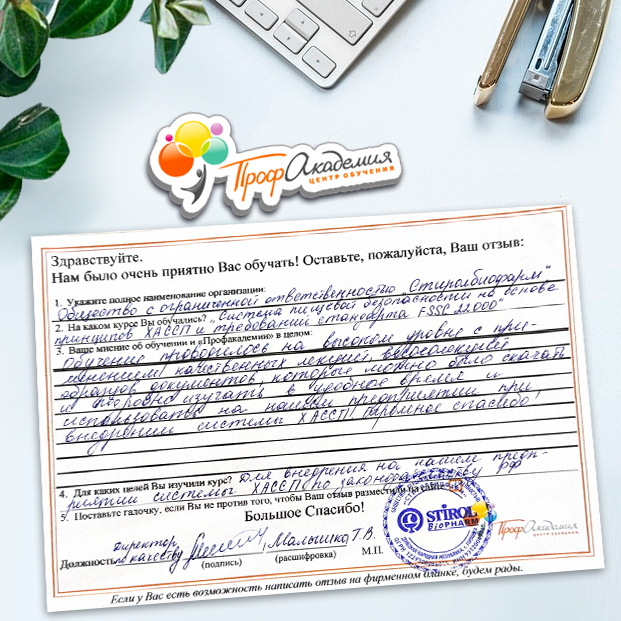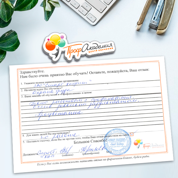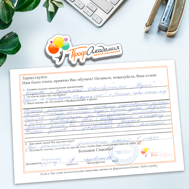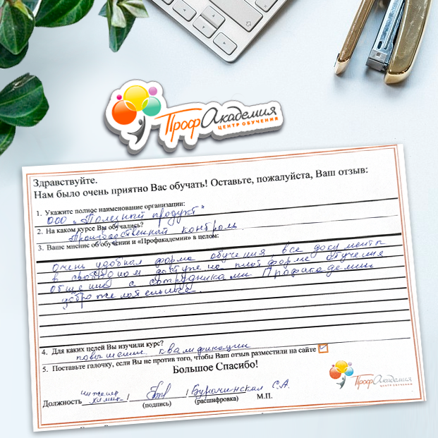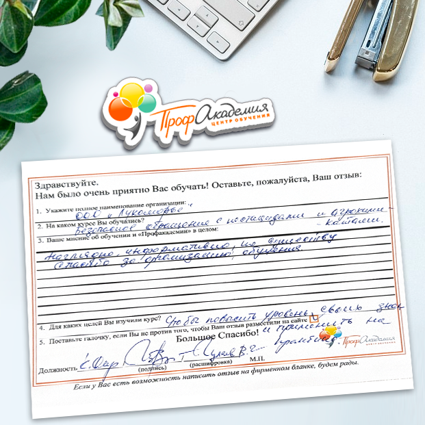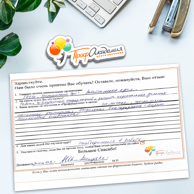 Наши сотрудники неоднократно проходили обучение в Вашей академии и с огромным удовольствием вернемся к Вам снова. Все доступно, понятно и отлично! Большое спасибо!