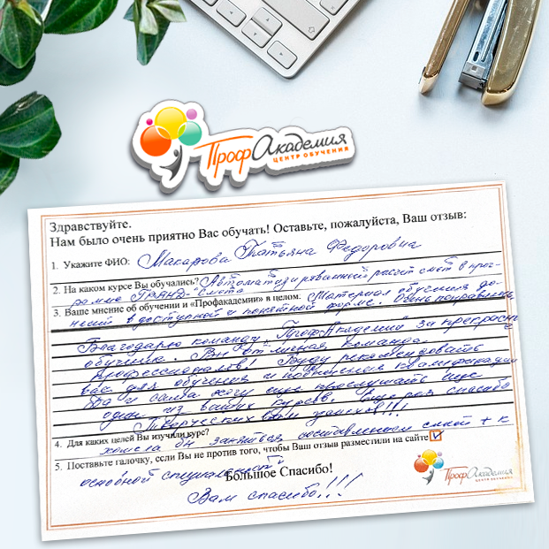 Хочу выразить огромную благодарность всей группе Профакадемии. Понравилось все. Вся информация об обучении находится в доступной форме. Очень боялась когда нашла обучение, но все оказалось намного проще. Надеюсь все что изучила за время обучения станет замечательным фундаментом для моей новой жизни.