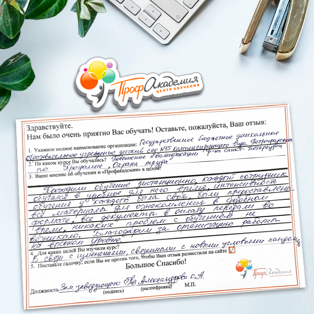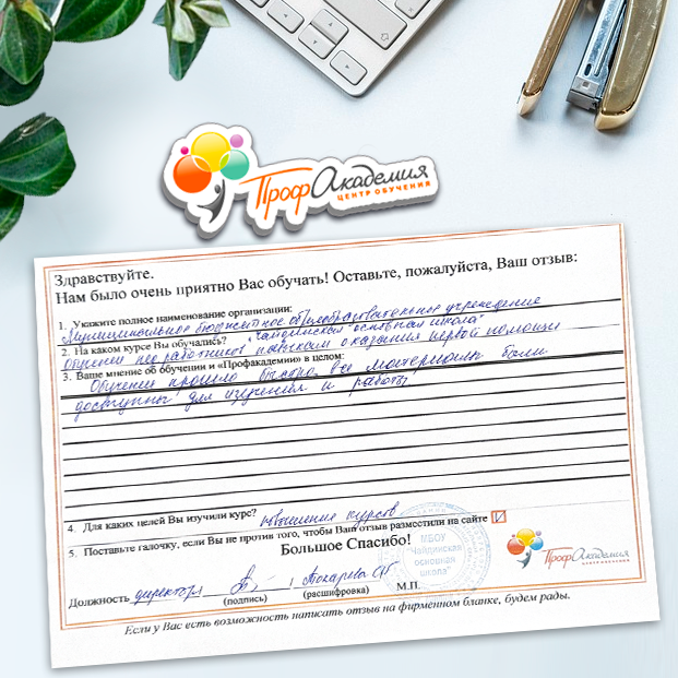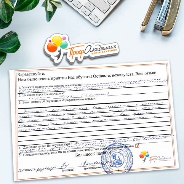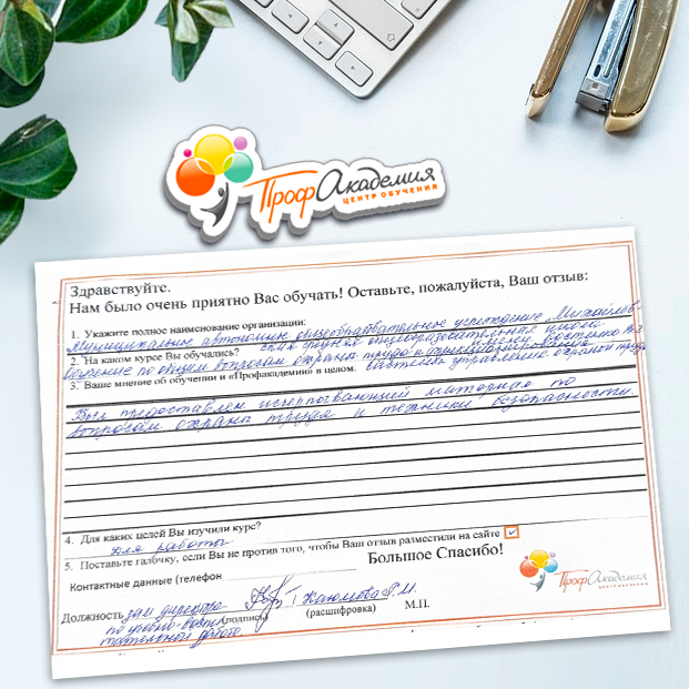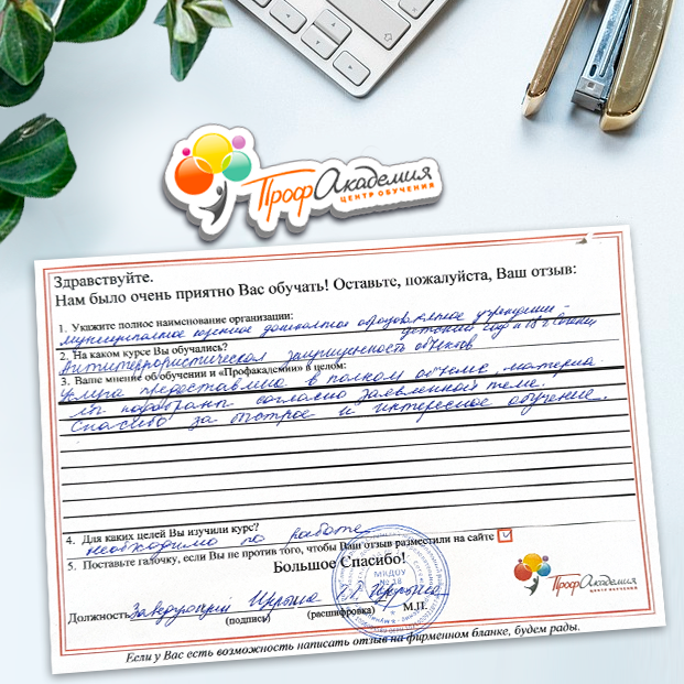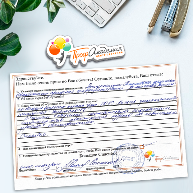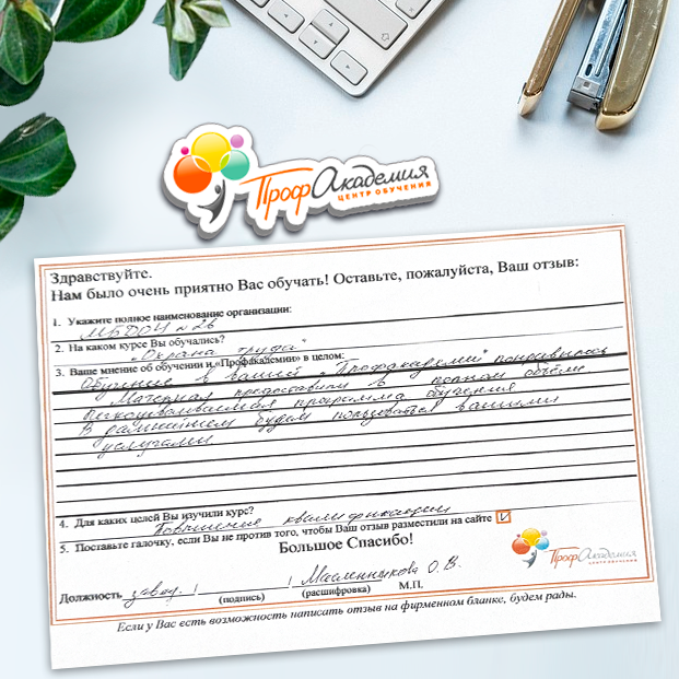 Выражаю благодарность за отлично проведенную работу по повышению квалификации. Можно отметить высокую квалификацию преподавательского состава, четкую и профессиональную работу специалистов "Профакадемии" при организации учебного процесса, а также качество профессиональных знаний. Мы благодарим за высокопрофессиональный подход и качественную подачу материала