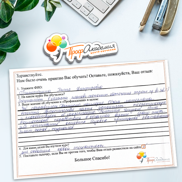 Огромное спасибо за очень доступный, интересный, объемный курс обучения. Самое главное, что учиться можно в удобное для себя время, не прерывая свою трудовую деятельность.