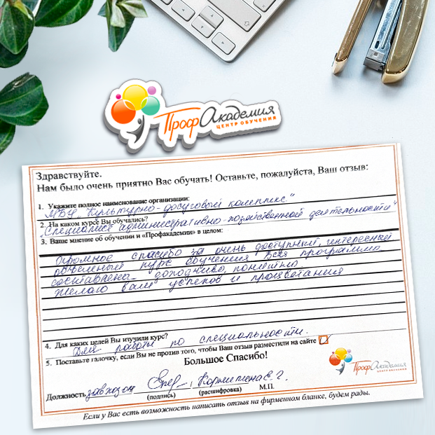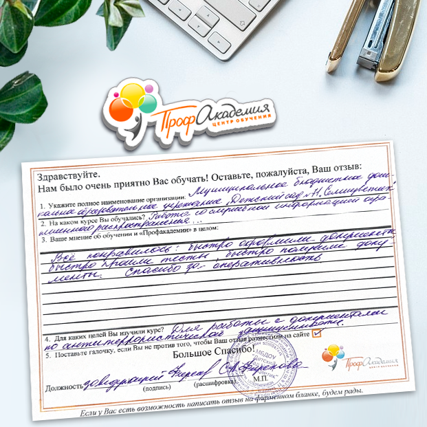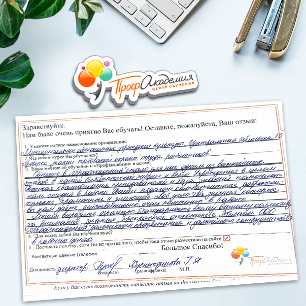 Обучение в "Профакадемия" стало для нас одним из важнейших этапов в нашей библиотечной жизни и всего Учреждения в целом. Высокая квалификация преподавателей и база знаний помогают нам сегодня в работе. Ваши педагоги компетентные, доброжелательные, грамотные и знающие свое дело. Те знания, которые вы нам даете, действительно, очень помогают в работе. Хотим выразить огромную благодарность всему вашему коллективу за внимание, знания, прекрасное отношение. Желаем ООО "Профакадемия" дальнейшего процветания и дальнейшего сотрудничества!