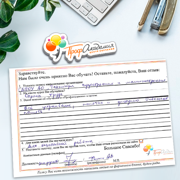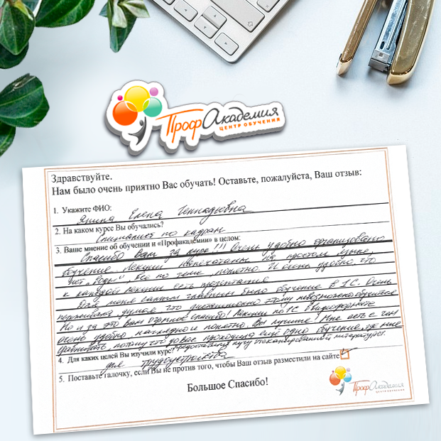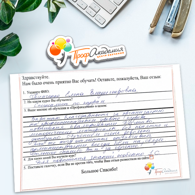 Не первый год сотрудничаем с "Профессиональной Академией". Хочется отметить сотрудников Академии за отзывчивость и оперативность в работе, и за доброжелательность к обращающимся к ним людям. Обучение - понятное и эффективное. Спасибо большое.