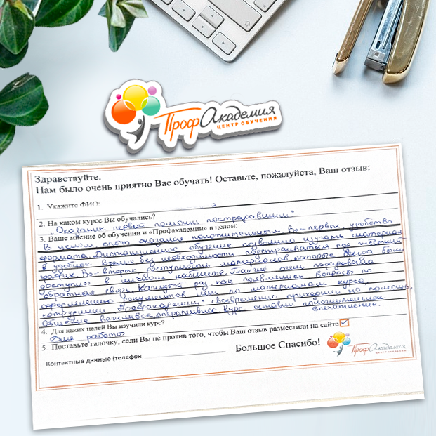 В целом опыт оказался положительным. Во-первых, удобство формата. Дистанционное обучение позволило изучать материал в удобное время, без необходимости подстраиваться под жесткий график. Во-вторых, доступность материалов, которые всегда были доступны в личном кабинете. Также очень порадовала обратная связь. Каждый раз, как появлялись вопросы по оформлению документов или по материалам курса, сотрудники "Профакадемии" своевременно приходили на помощь. Общение вежливое, оперативное. Курс оставил положительное впечатление.
