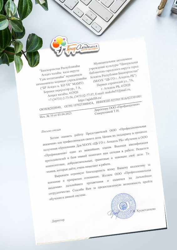 Хотим оценить работу Представителей ООО "Профессиональная академия" как профессионалов своего дела. Ценим их поддержку в процессе получения образования. Для МАУК "ЦБ ГО г. Агидель РБ" обучение в ООО "Профакадемия" одно из важнейших этапов. Высокая квалификация преподавателей и база знаний помогают нам сегодня в работе. Педагоги компетентные, доброжелательные, грамотные и знающие свое дело. Те знания, которые даете, очень помогают в работе. Выражаем огромную благодарность всему Вашему коллективу за внимание и прекрасное отношение. Желаем ООО "Профессиональная академия" дальнейшего процветания и надеемся на дальнейшее сотрудничество. Спасибо Вам за предоставленную возможность пройти обучения в данной системе.